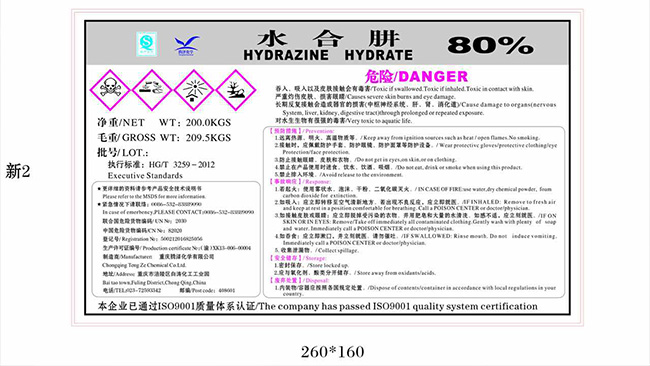 水合肼為強還原劑,是醫(yī)藥、農(nóng)藥、染料、發(fā)泡劑、顯像劑、抗氧劑的原料;大量用作大型鍋爐水的脫氧劑;還用于制造高純度金屬、合成纖維、稀有元素的分離。此外,還用來制造火箭料和炸藥等。也用作分析試劑。用作發(fā)泡劑的肼衍生物大部分是偶氮二甲酰胺(AC),還有甲苯磺酸肼等。用作醫(yī)藥的衍生物,肼量較多的是異煙肼、芬基氨硫脲和苯磺酰氨硫脲,還有抗精神病藥1-異煙酰基-2-異丙肼、抗癌藥醛基肼衍生物、抗感染藥5-硝基呋喃甲叉肼衍生物、抗生素唑啉頭孢菌素、利尿降壓藥肼苯噠嗪、抗腫瘤藥甲基苯肼等。用作農(nóng)藥的肼衍生物有植物生長調(diào)節(jié)劑馬來酰肼衍生物、殺鼠劑二鼠劑硝基苯肼、殺蟲釘菌劑吡唑衍生物與5-硝基呋喃氨硫脲,除草劑氨基三唑等。在日本,肼的用途分配中1/3以上是作鍋爐水的去氧劑,發(fā)泡劑用的肼(包括水合肼和硫酸肼)約占30%,用于蒙朧藥占10%。